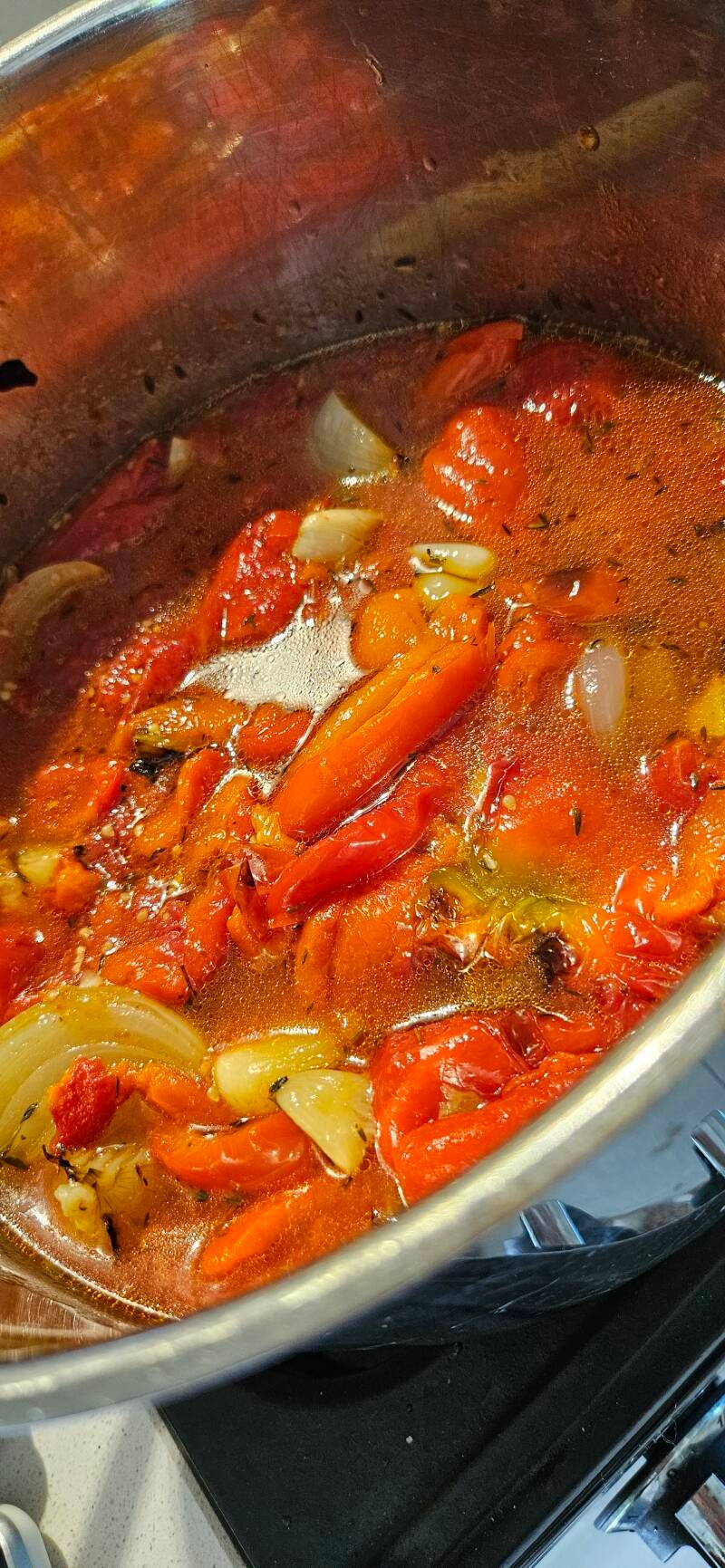 Soep van geroosterde paprika en zoete snoeptomaatjes.