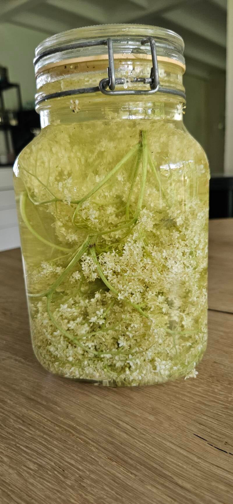 De dauw is er af...even pot vol vlierbloesems gevuld. Maken we maandag siroop van! Wat een weelde die tuin nu. Zeker vergeleken met vorig nat- en slakkenjaar waarbij zelfs de vlieren niet gespaard bleven. Een come back. En hoe!