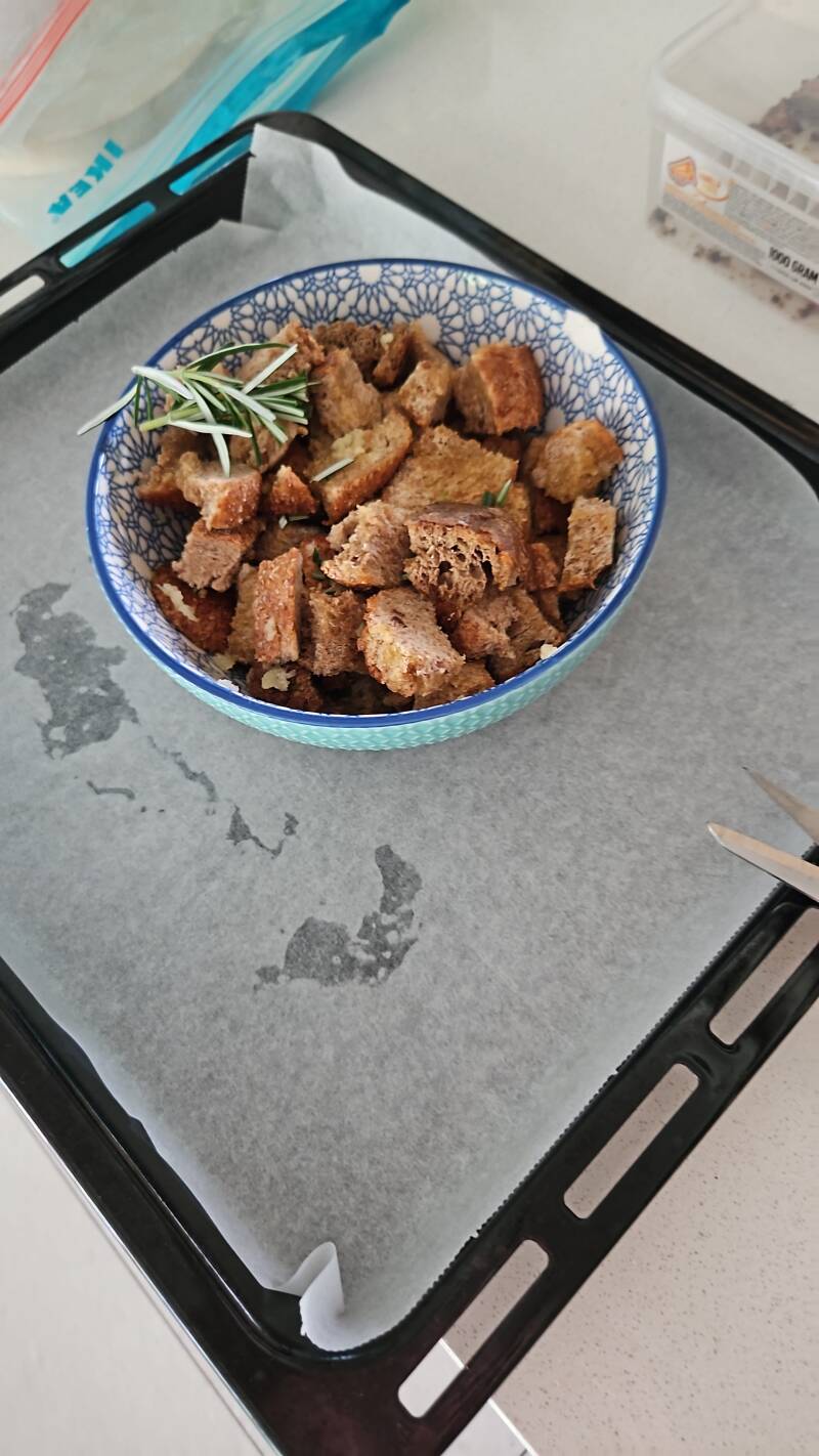 Verse croutons ..volkorenbrood, olijfolie, knoflook en rozemarijn uit de tuin